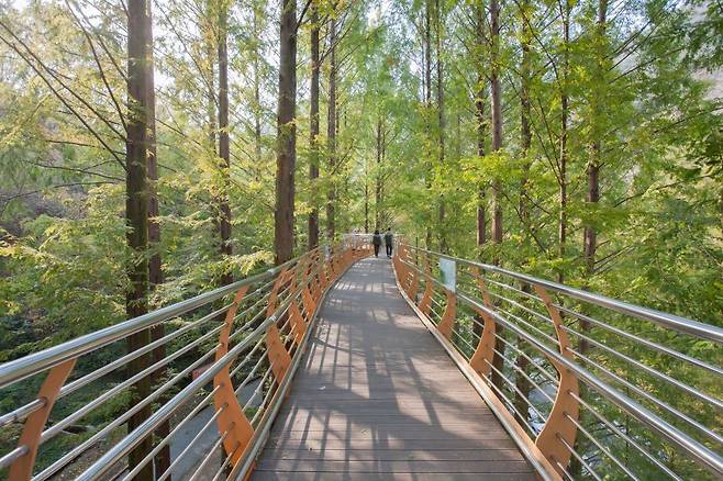 하늘 높이 뻗은 국내 유일의 메타세쿼이아 숲이 울창하게 우거져 있는 장태산 자연휴양림. 청량한 공기를 마시며 몸 안에 있던 나쁜 기운이 싹 가시는 것만 같은데요.