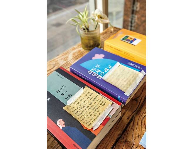 이처럼 책방의 문턱을 낮추기 위한 노력 덕에 손님의 절반 이상은 매주, 매달 한 번씩은 찾아오는 단골입니다. “책방지기의 질문에 좋은 답변을 하고 싶어서 책을 더욱 열심히 읽는다”고 말하는 손님이 있을 정도입니다. 대화를 나누다 보면 거꾸로 손님이 책을 추천해주는 일도 많습니다. 그중 배 대표가 인상 깊게 읽은 책은 판매 도서로 들여오기도 합니다. 책 표지엔 손님이 직접 쓴 추천사를 함께 붙여 놓습니다.