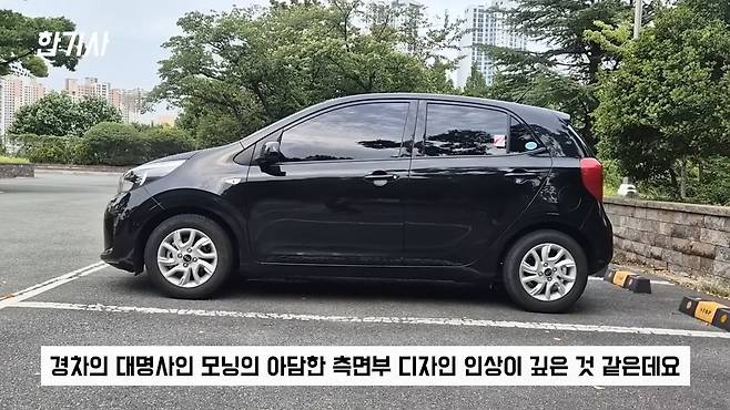 그리고 측면부를 보면 경차의 대명사인 모닝의 아담한 측면부 디자인 인상 깊은데요. 이 차량 휠은 아마 14인치의 휠일 겁니다. 최상위 트림 가게 됐을 때는 16인치까지 다양한 선택이 가능하고요.