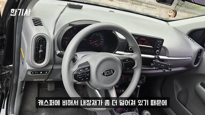 또 다른 장점은 캐스퍼에 비해서 내장재가 좀 더 덜어져 있기 때문에 저처럼 약간 키도 크고 덩치가 큰 사람이 타기에도 편하고요. 캐스퍼는 도어 쪽에 있는 내장재가 두꺼운데요. 저처럼 덩치 큰 사람들은 탔을 때 다리가 오므려지게 되면서 차를 운전할 때 좀 더 불편한 부분이 있습니다. 근데 이 차량은 이제 내장재가 최소한으로 간략하게 되어있기 때문에 저처럼 덩치도 크고 키도 큰 사람이 타기에 편한 것 같습니다.