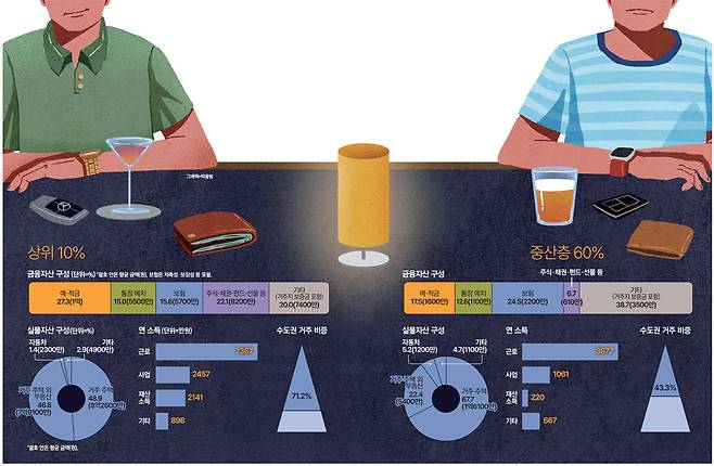 수도권에 거주하는 비율도 자산 격차에 일조했다. 상위 10% 가구는 전체의 71.2%가 수도권에 거주하고 있었던 반면 중산층에서는 43.3%였다. 최근 몇 년간 수도권 집값이 급등한 점을 감안하면, 두 계층 간 자산 격차는 더욱 크게 벌어졌을 것으로 유추할 수 있다.