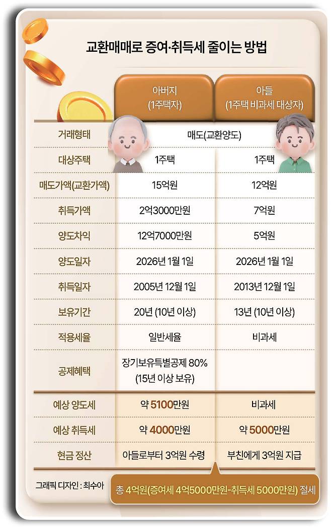 그래도 아버지의 경우 공제 혜택을 노려볼 수 있어요. 아버지는 해당 주택을 20년 이상 보유해 장기보유특별공제(최대 80%)를 적용받을 수 있습니다. 이를 감안하면 교환 거래 시 아버지가 부담할 양도세는 약 5100만원 수준으로 추산됩니다.