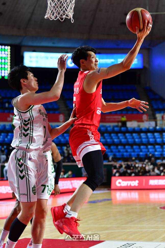 SK 김선형이 4일 잠실 학생체육관에서 열리는 2022-23프로농구 서울SK와 원주DB의 경기에서 수비를 따돌리며 리버스레이업슛을 시도하고 있다. 2023.1.4.