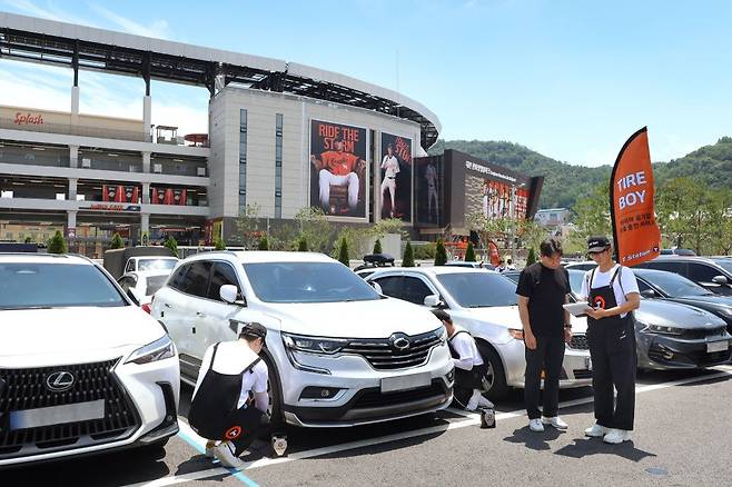한국타이어는 대구 삼성 라이온즈파크에서 '타이어 보이’ 이벤트를 처음 선보였다. 이벤트는 타이어 중심 자동차 토탈 서비스 전문점 ‘티스테이션(T’Station)’을 통해 여름철 프로야구 팬들의 안전하고 쾌적한 드라이빙 환경을 지원하고자 기획했다.