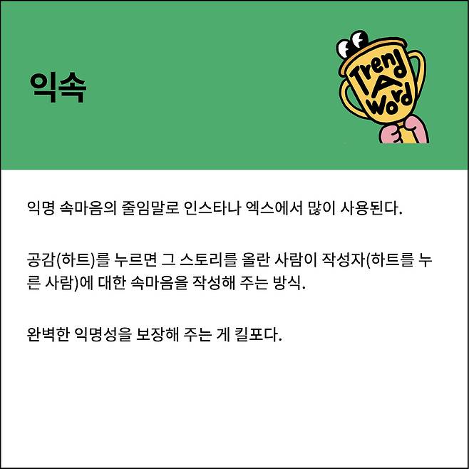 이미 서로 알고 있는 사람들 사이에서 익명성을 넣어서 본인의 감정을 표현하는 방식이 바로 익속마!