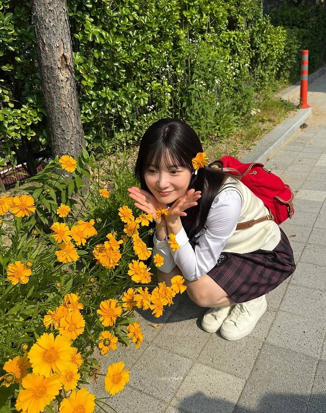 이번 스타일링은 교복 특유의 단정함을 유지하면서도 소품으로 변화를 준 것이 포인트다. 레드 컬러 백팩은 컬러 대비를 통해 발랄함을 주고, 귀에 꽂은 노란 꽃은 소녀스러움을 배가시켰다. 특히 화사한 플라워 아이템을 헤어 액세서리처럼 활용하는 연출은 따라 하기 좋은 팁으로, 데일리룩에도 포인트를 줄 수 있는 아이디어다.