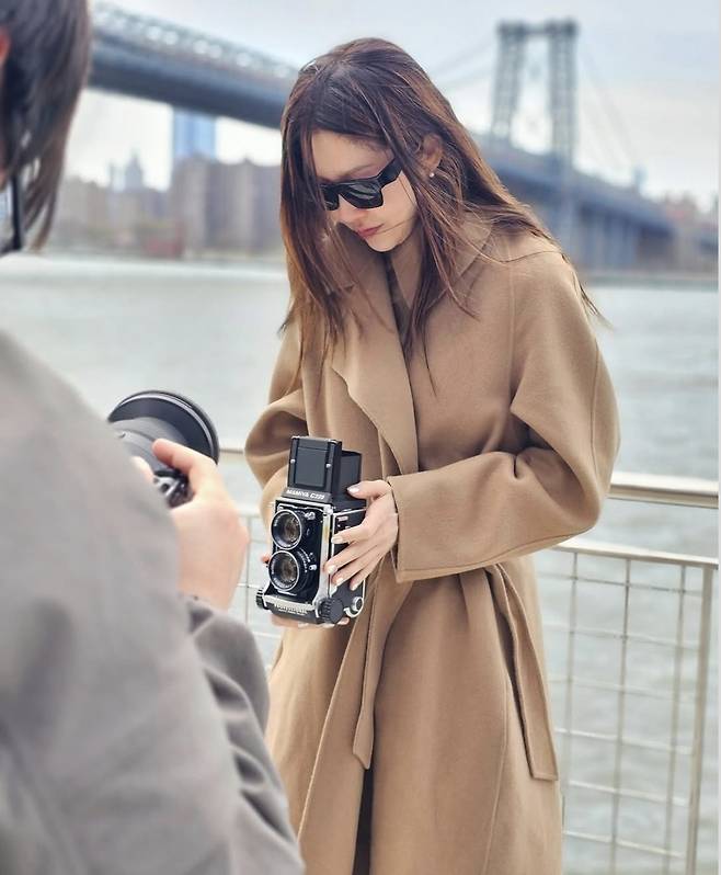 롱 트렌치코트에 선글라스를 매치한 고현정은 카메라를 들고 클래식한 무드를 완성했습니다.