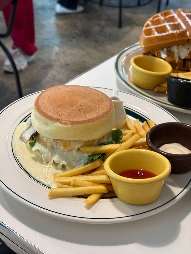 수플레팬케이크가 올려진 수제버거입니다.