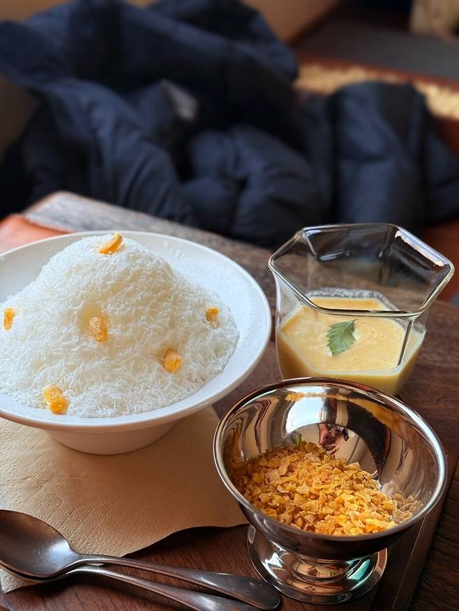 그리고 주문은 가장 유명한듯한 옥수수빙수와 당고세트,
