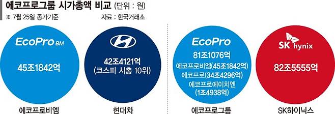 에코프로그룹의 시가총액은 이날 처음 80조원을 넘어섰다. 에코프로비엠과 에코프로, 에코프로에이치엔(1조4938억원)을 합치면 81조1076억원에 달한다. 코스피·코스닥에 상장된 단일 종목과 비교했을 때 SK하이닉스(82조5555억원)에 버금가는 수준이다.