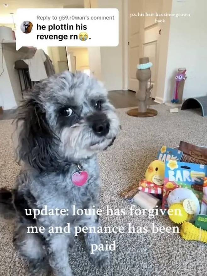 집사가 장난감과 간식으로 극대노한 강아지 루이의 마음을 달래줬고 털도 조금씩 자라면서 예전의 귀여움을 되찾아가고 있는 중이라는 후문입니다.