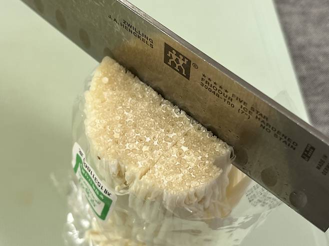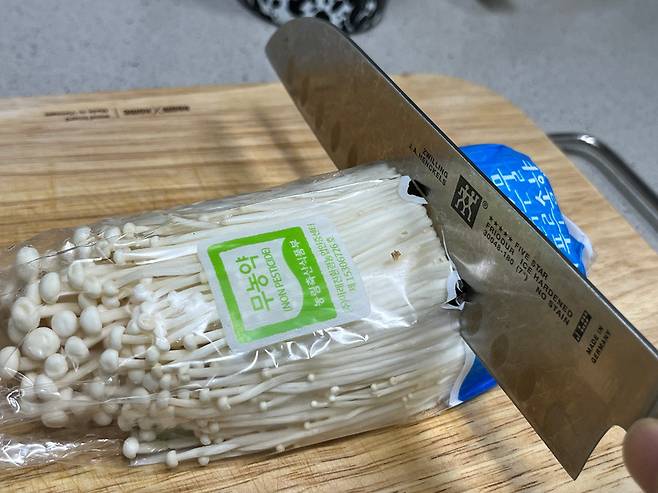 비닐째로 도마에 놓고 칼로 밑동을 숭덩 잘라주면 깔끔하게 잘립니다. 팽이버섯 끝부분에는 톱밥 등이 묻어있어 반드시 제거하고 먹어야 합니다.