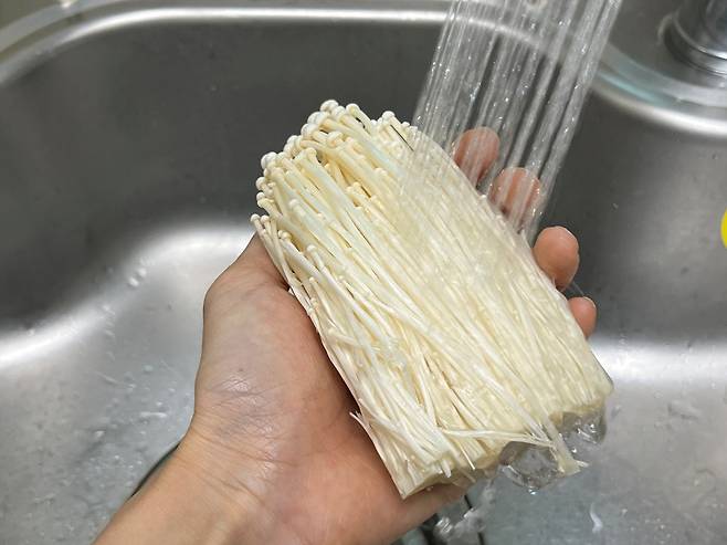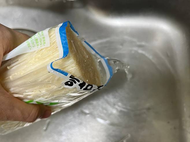 팽이버섯은 가느다란 가닥으로 이루어져 있어, 비닐을 벗기는 순간 낱낱이 흩어집니다. 그래서 세척할 때도 웬만하면 비닐째로 해주는 것이 좋습니다.