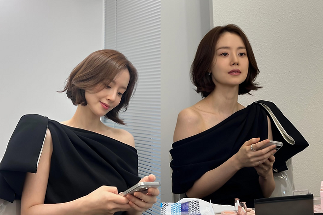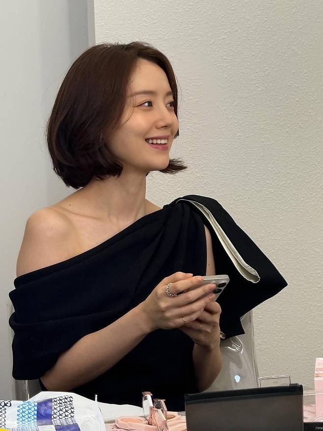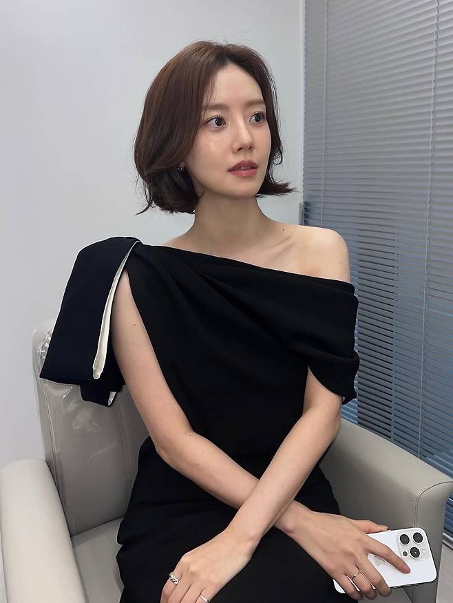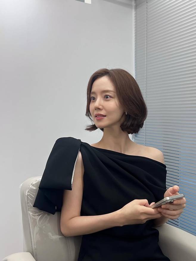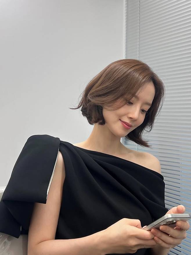 턱선까지 짧아진 새로운 단발머리와 민낯에 가까운 메이크업, 그리고 우아한 블랙 드레스.