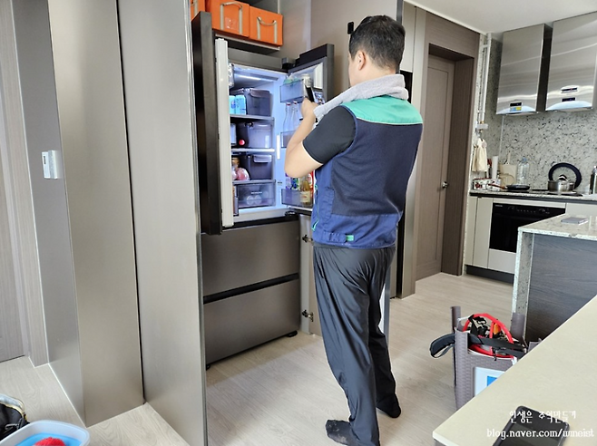 한 분이 김치냉장고 본체를 청소해 주신다면, 다른 한 분은 서랍과 선반을 분리해 싱크대에서 물청소와 건조를 해주셨어요.