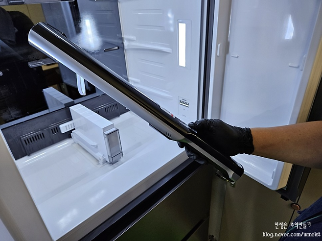 먼저 냉장고 안의 물건을 빼고 고온 스팀 세척이 진행되었어요.