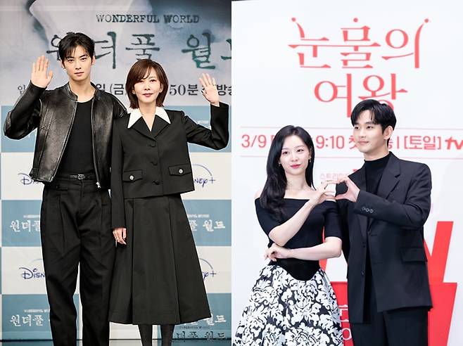 '원더풀 월드'가 먼저 방송을 시작한 가운데 '눈물의 여왕'이 일주일 차이로 합류하면서 매주 토요일 밤마다 주말극 최강자 자리를 놓고 김남주와 박지은 작가의 승부가 펼쳐질 전망이다.