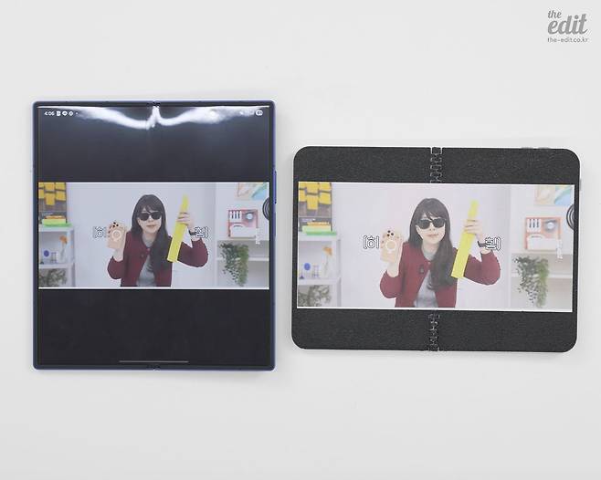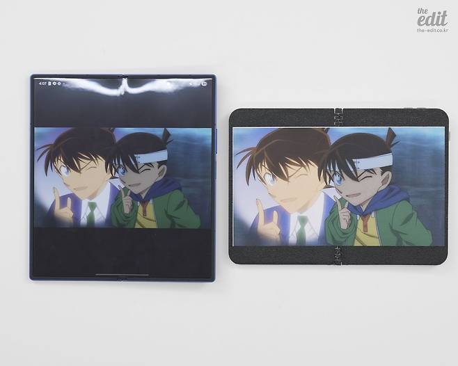실제로 2:1에 가까운 디에디트 메인 채널 영상이나, 16:9 비율인 어느 애니메이션의 한 장면을 캡처해서 비교해 보면 갤럭시 Z 폴드 7보다 훨씬 주어진 화면을 잘 활용하는 모습입니다. 위아래의 레터박스가 훨씬 작죠. 갤럭시를 더 긴 축으로 회전해서 본다고 해도 아이폰보다 기기 자체 기준으로 9mm 더 짧아서 여전히 아이폰 쪽에서 더 크게 볼 수 있습니다.
