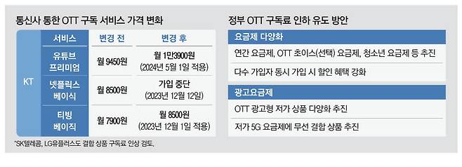 OTT 가격 부담을 낮추기 위한 대책이 곧 발표될 것으로 예상되는 가운데 우선 통신사의 저가 요금제에 넷플릭스나 티빙이 도입한 광고형 상품을 붙여 내놓는 것이 현실적인 방안으로 검토되고 있다.