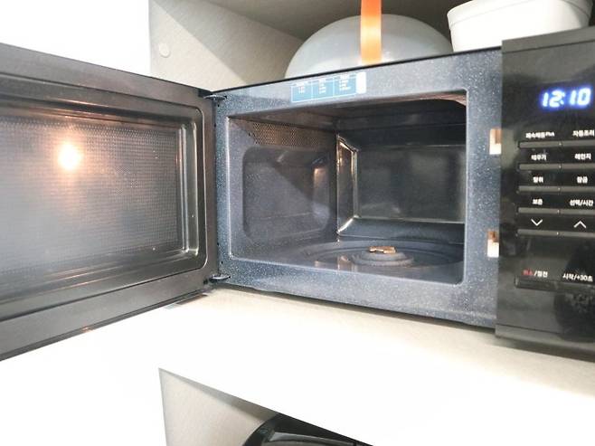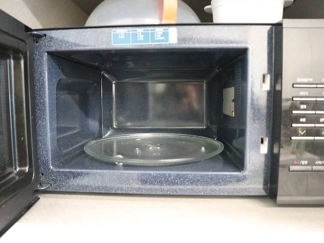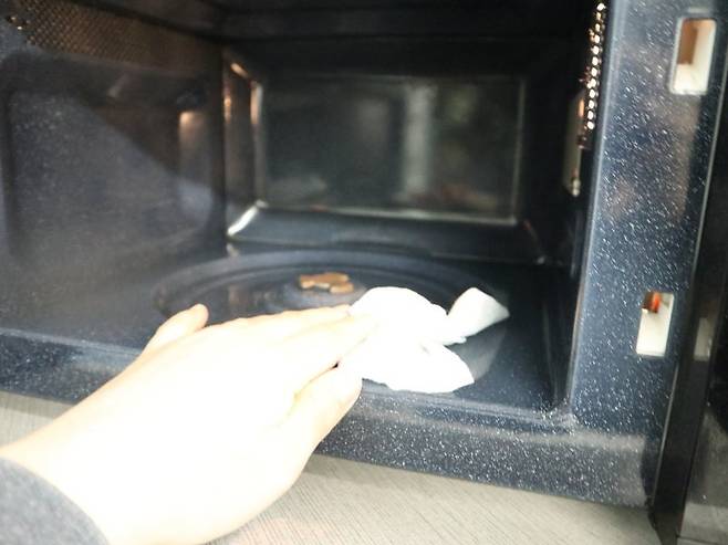 3. 내부 닦기: 마른 행주로 전자레인지 내부를 깨끗하게 닦아줍니다. 물기가 거의 없도록 꼼꼼하게 닦아주세요.