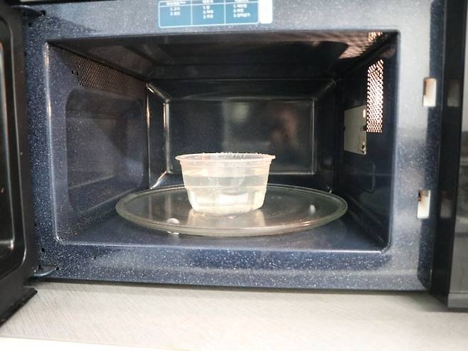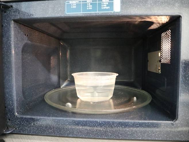 2. 전자레인지 작동: 식초물을 넣은 용기를 전자레인지에 넣고 3~5분 정도 작동시킵니다. 내부에 습기가 가득 차도록 해주세요.