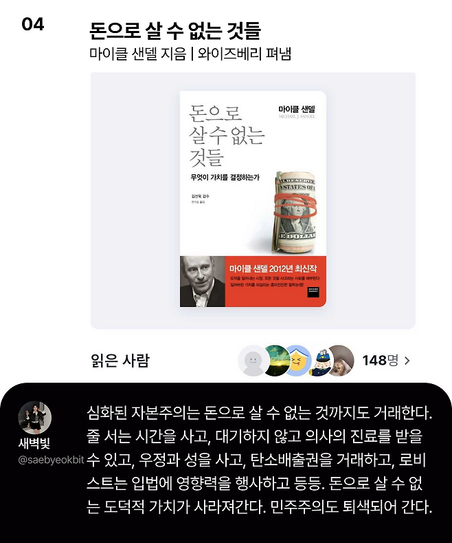 돈으로 살 수 없는 도덕적 가치가 사라져간다. 민주주의도 퇴색되어 간다.