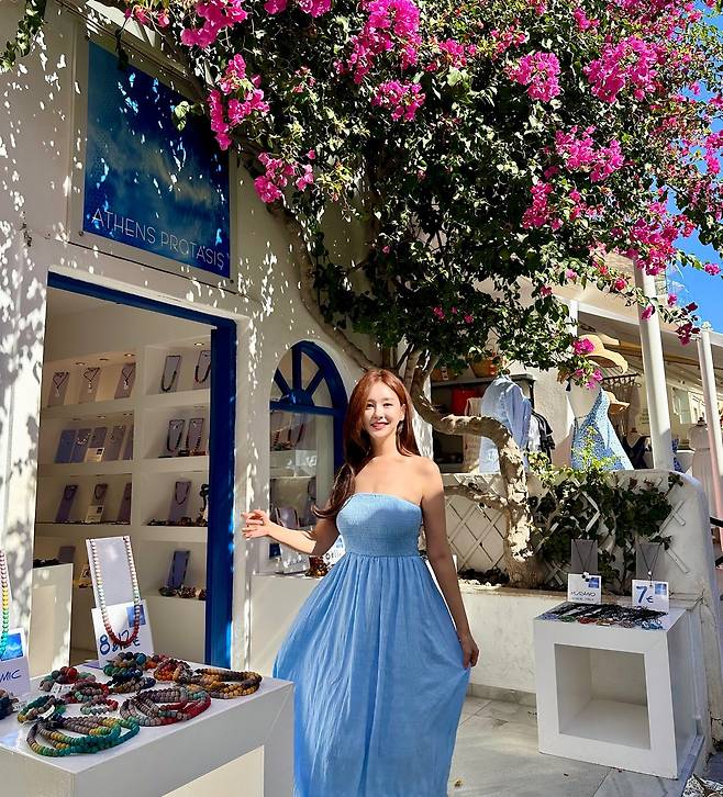 네 번째 사진에서 공서영은 플라워 마켓 앞에서 밝은 블루 컬러의 튜브톱 롱 드레스를 입고 있다. 허리 라인이 잡힌 디자인과 화사한 컬러가 경쾌하고 로맨틱한 무드를 연출하며, 핑크빛 부겐빌레아와 어우러져 여름 휴양지의 활기를 전하고 있다.