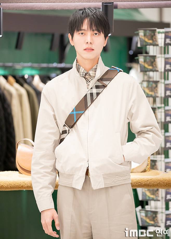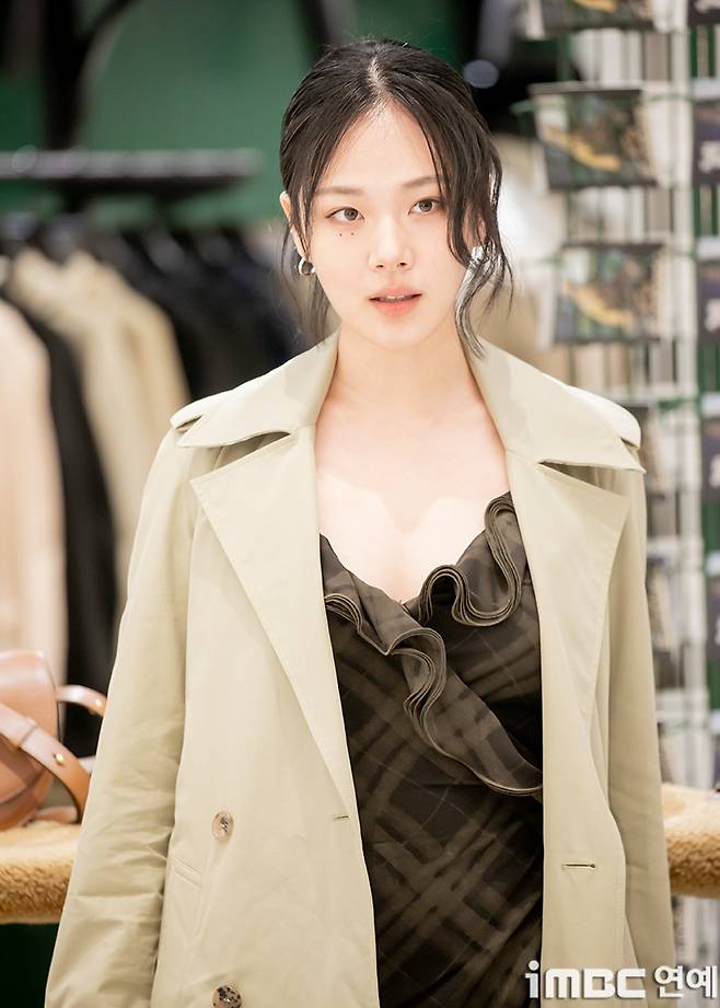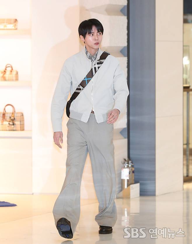 베이지 팬츠의 조합이 고급스러우면서도 깨끗한 인상을 주었으며