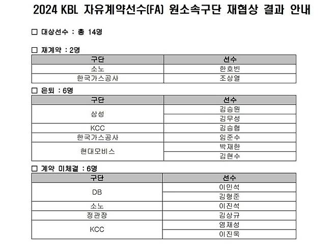 KBL은 28일 보도자료를 통해 2024 KBL 자유계약선수(FA) 원 소속 구단 재협상 결과를 발표했다.