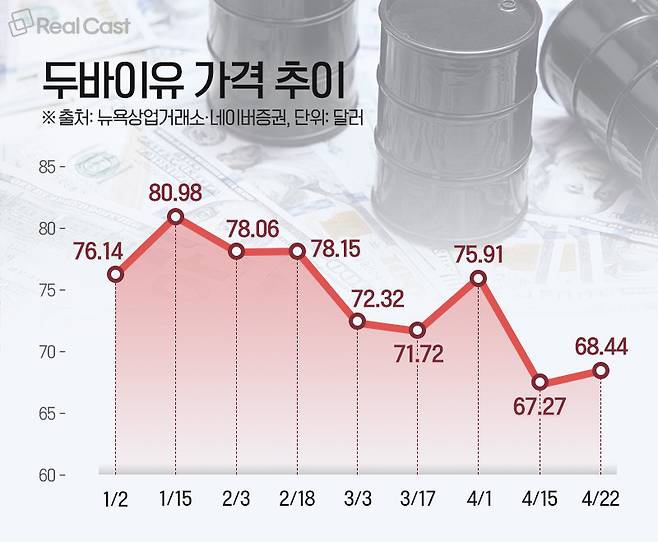 실제로 국제유가는 안정세를 보이고 있습니다. 우리나라가 주로 수입하는 두바이유의 경우 22일 종가는 68.44달러로 마감했습니다. 이는 연초 80달러대를 넘나들던 때에 비해서 10달러 이상 낮은 수준으로 지난 4일 종가 69.02달러로 마감한 이후 60달러대에서 거래되고 있는 상황입니다.