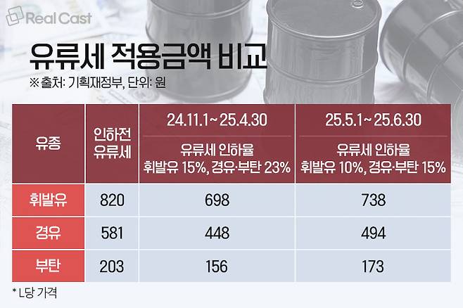 유류세 인하 조치 이전과 비교하면 휘발유와 경유는 L당 각각 82원, 87원씩 유류세 부담이 줄어든 것으로 볼 수 있습니다.