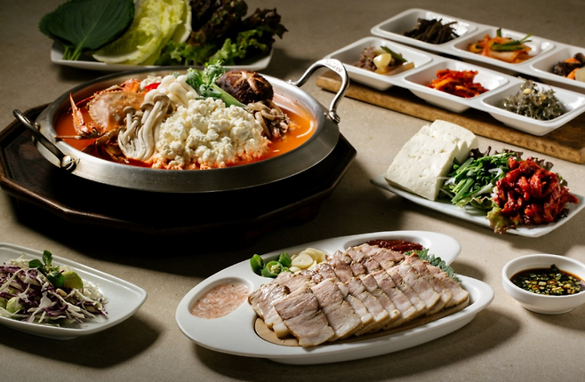 순두부전골 + 모두부 + 수육 + 가자미식해 + 반찬 6~7가지