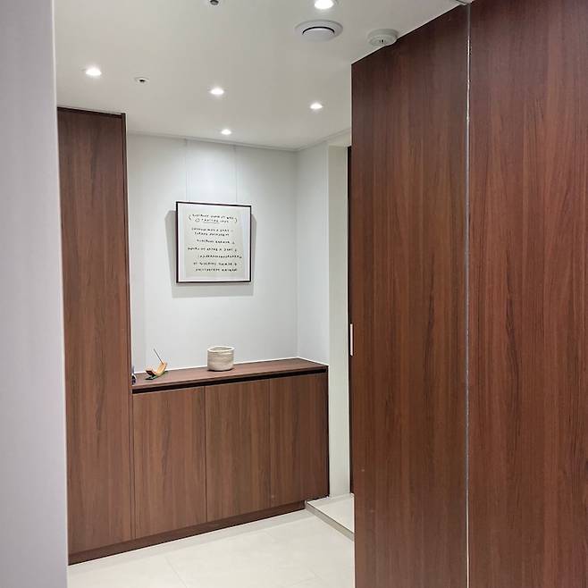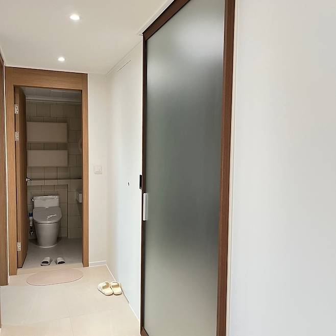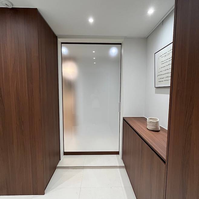 현관문을 열었을 때 답답해 보이지 않도록 불투명한 중문을 선택했어요. 실루엣 정도만 비춰져서 안에 불이 켜져 있는지 확인할 수 있어서 좋았어요. 그리고 저희는 알파룸(팬트리) 공간을 없앴기 때문에 골프백과 캐리어를 넣을 수 있도록 왼쪽에는 큰 짐을 넣을 수 있는 넓고 깊은 장을 짜서 넣었어요.