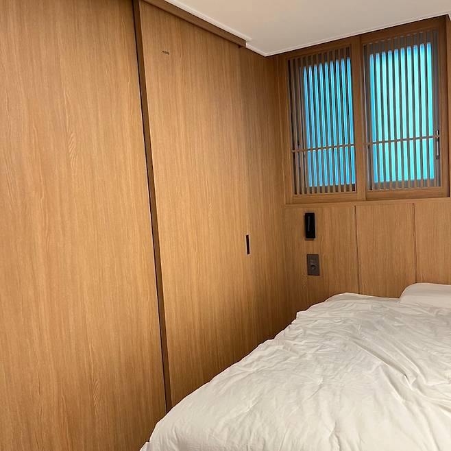 그리고 안방에 애매하게 달려 있는 창문이 하나 있는데 전부 가리기에는 이쪽에서 보는 바깥 풍경이 꽤나 좋아서 간살 도어로 가려주었습니다.