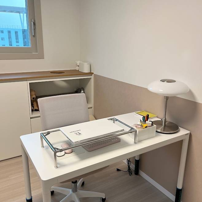 지금은 사무공간으로 쓰고 있지만 나중에 아이가 생기면 아이방으로 쓰고 싶어서 투톤으로 도배만 했어요. 그리고 정면에 보이는 수납장 역시 미야옹철 수의사님 집을 보고 똑같이 만들었습니다ㅎㅎ