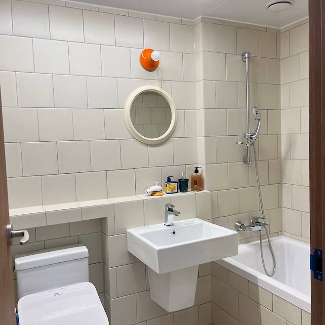 타일과 거울이 작고 수납공간이 넓지 않아 실용성 면에서는 조금 떨어지지만 주로 손님들이 사용하기 때문에 아직까지 불편함은 못 느꼈어요! 무엇보다 손님들이 저희 집에 놀러 오면 호텔 화장실 온 것 같다고 너무 좋아해 주시니 후회는 없답니다.