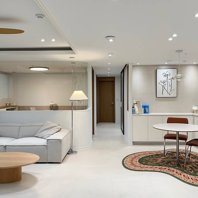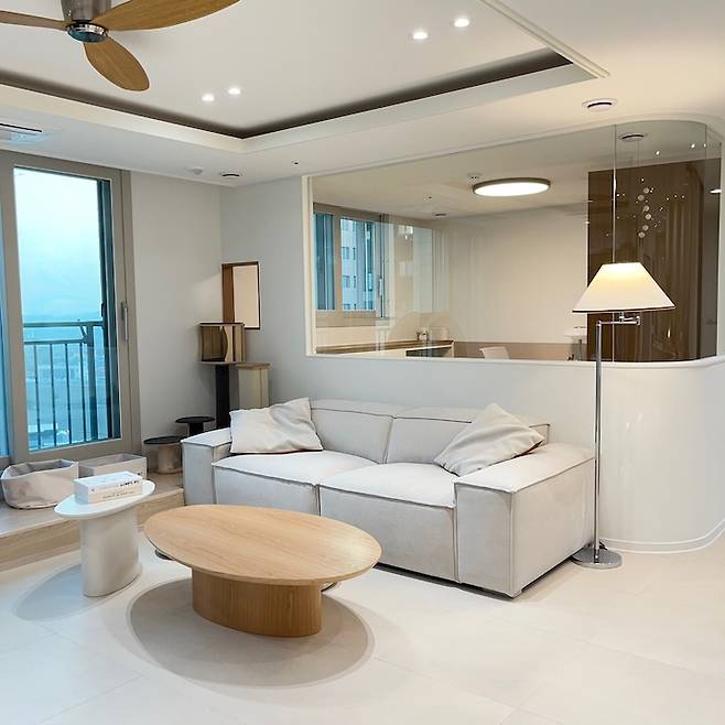저희 거실이에요. 팬트리만큼이나 고민을 많이 한 곳인데요. 가장 많이 사용할 곳이니만큼 개방감을 주고 싶어서 두 번째 방 벽을 철거하고 유리로 만들었어요.