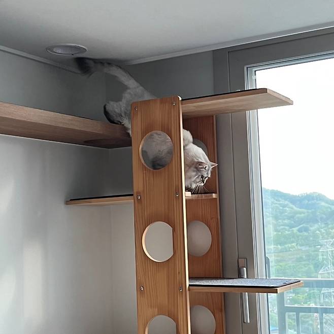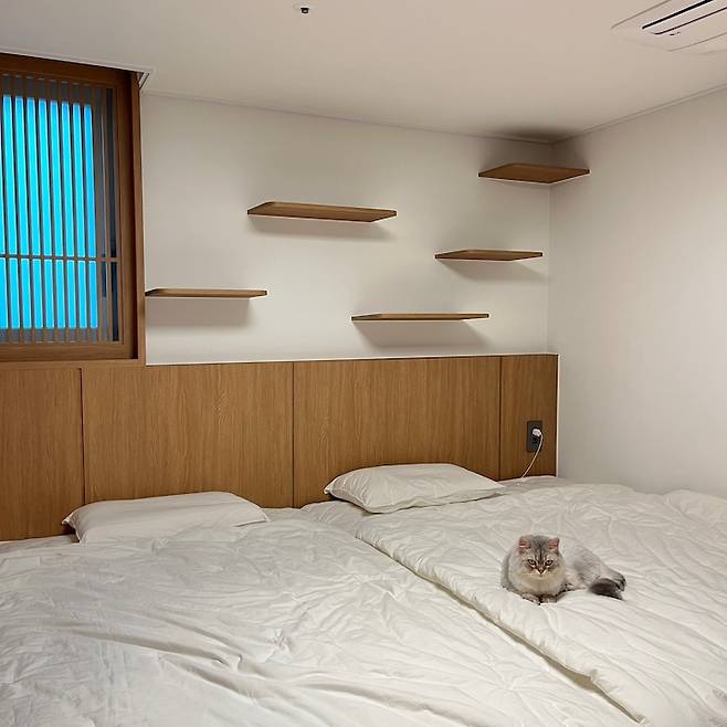 캣테리어 답게 안방에도 캣워커를 달아주었어요. 항상 저희랑 꼭 붙어 자는 아이들이기에 조금 더 편하게 잘 수 있도록 머리 위쪽으로 달았습니다. 저희 평화는 저 위에 올라가서 자는 저희를 내려다보는 것을 좋아해요^^