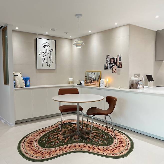 무엇보다 친구들이 집에 놀러 오면 꼭 한 번씩 사진 찍고 가는 포토존이기에 뿌듯함도 2배! 아침에 일어나서 이 식탁에 앉아서 브런치를 먹으면 마치 이쁜 카페에 와 있는 느낌이 들어요 ㅎㅎ 저희 부부는 커피를 안 먹어서 만들어 놓지 않았지만 홈카페를 열어 놔도 참 좋을 공간이에요.