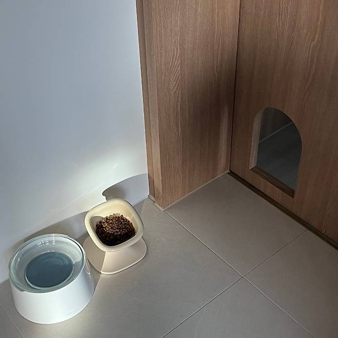 고양이들이 수납장을 밟고 올라가서 동선이 끊기지 않고 거실로 넘어갈 수 있도록 구멍에 맞춰 높게 만들었어요. 제가 노트북으로 작업을 하거나 책을 보고 있으면 어김없이 수납장 위에 앉아서 식빵을 굽는답니다.