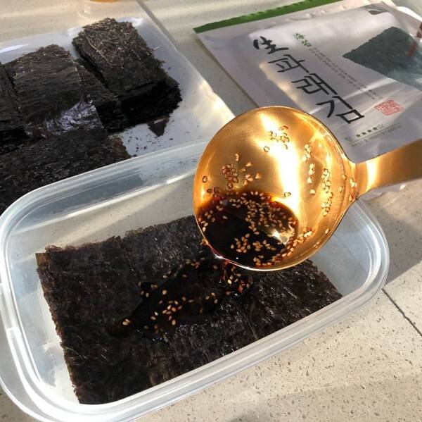 김과 양념장이 모두 식은 상태가 되면, 밀폐용기 바닥에 김을 한 층 깔고 그 위에 양념장을 적당히 붓는 방식으로 반복해 쌓아준다. 너무 빽빽하게 누르기보다는 약간의 공간을 두고 겹쳐야 양념이 김 사이사이 잘 스며든다.