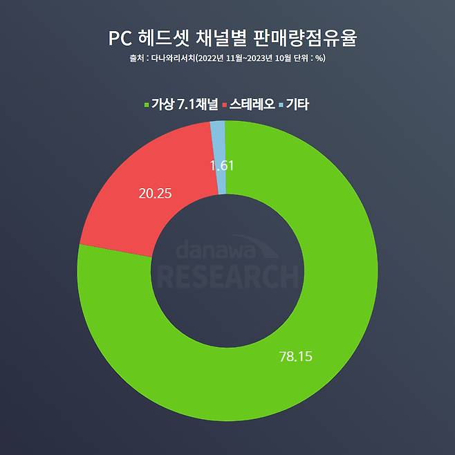 사실 스테레오 지원 제품군은 초저가 제품군에 많이 있다. 그걸 제외하고는 가상 7.1채널이 PC 헤드셋 시장의 대세로 군림하고 있다고 볼 수 있다. 가상 채널이니 소프트웨어적으로 구현만 하면 되는 기술이므로 대부분 채택한 것으로 보인다. 또한, 재미있는 것은 리얼 7.1채널 제품도 있긴 있다는 것이다. 점유율이 1.61% 정도다.