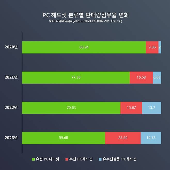 일례로 PC 헤드셋 중 유선 방식의 비중은 2020년 88.94%에 육박했다. 그런데 이렇게 무식하게 높았던 점유율은 점점 감소하기 시작하더니 2023년엔 59.68%를 기록했다. 그럼 이렇게 내려간 점유율은 어떤 제품이 대체했을까? 당연히 무선 방식이다. 무선 방식은 2020년 9.06%로 미약했으나, 2023년 25.59%의 점유율로 상승했다. 참고로 유무선 겸용 PC 헤드셋도 2%에서 14.73%로 점유율이 상승했다. 무선으로 사용할 수 있는 제품만 다 놓고 보면 무려 40.32%다
