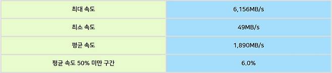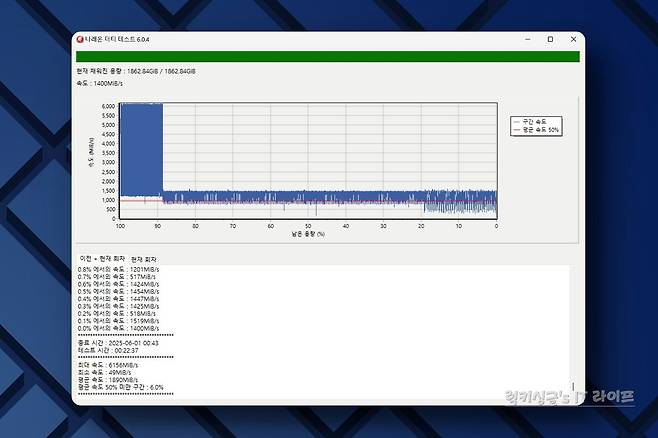 전체 용량 1862.84GB 중에서 212.16GB 구간부터 속도 저하가 발생했는데요. 초기에는 6,000MB/s 고속 성능을 유지했지만, 이후 1,400MB/s로 감소하는 모습을 보이더라고요. DRAM 캐시 (2GB)와 SLC 캐싱 기능을 통해서 200GB 이하의 대용량 파일을 전송에서는 큰 성능 저하 없이 빠른 속도 유지를 기대할 수 있겠네요.