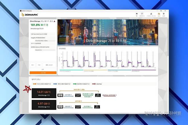3DMARK 테스트 결과를 보면 DirectStorage 기능을 활성화했을 때 게임 데이터 로딩 속도가 기존 4,97GB/s에서 14.01GB/s로 증가, 무려 181.8% 향상된 것을 확인할 수 있었어요~!