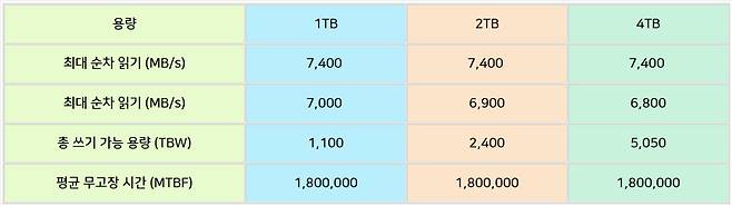 가령 매일 200GB의 데이터 쓰기를 가정할 경우, 약 70년 동안 사용할 수 있는 업계 최고 수준의 강력한 내구성을 제공해요. 이런 압도적인 내구성 덕분에 고성능 게임용 SSD뿐만 아니라 4K 영상 편집, 데이터 분석, 그리고 생성형 AI 크리에이터 환경에서도 최적의 성능을 발휘할 수 있죠~!