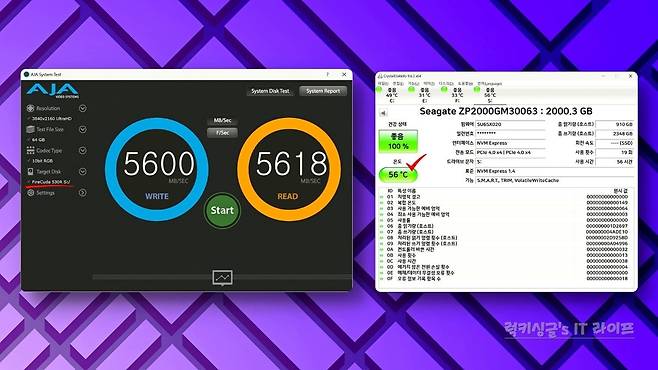 가장 먼저 영상 제작 환경에서의 드라이브 성능을 확인할 수 있는 AJA System Test 프로그램에서의 측정 결과는요?! 테스트 파일 크기는 64GB로 설정했을 때 최대 순차 읽기 속도 5618MB/s, 최대 순차 쓰기 속도는 5600MB/s 빠른 속도를 기록했어요. 테스트 과정에서 확인한 SSD 온도는 56 ~ 60℃ 사이로 비교적 안정적인 발열 상태를 유지하더라고요.