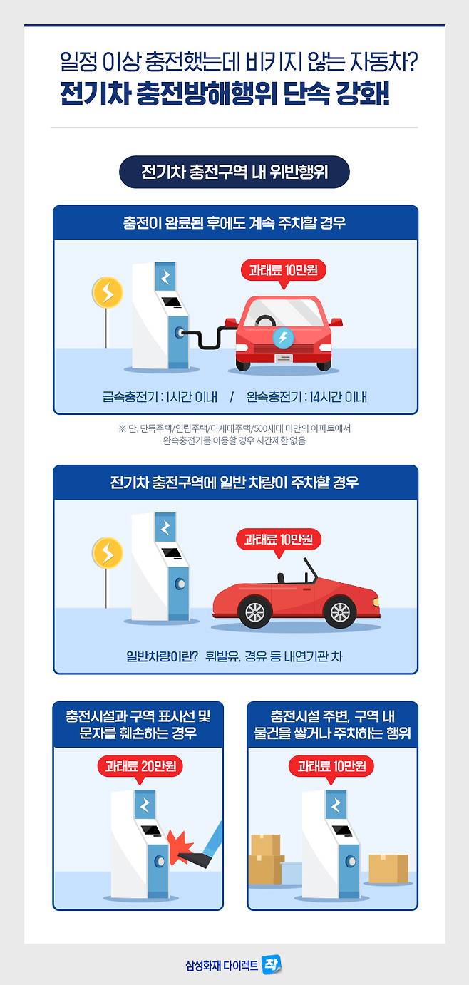 또한 전기차 충전 구역에 휘발유, 경유 등 전기차 충전 차가 아닌 일반 차량이 주차할 경우 마찬가지로 10만 원의 과태료가 부과됩니다.