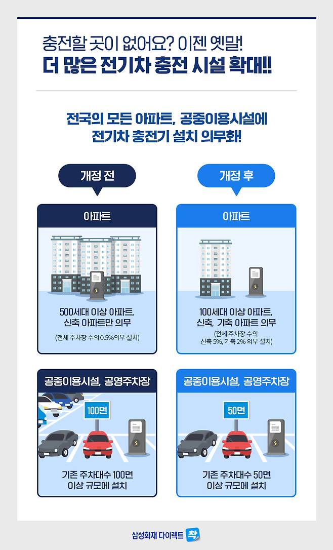 전기차의 공급이 확대되는 것에 따라 전기차 충전기를 필요로 하는 차량이 많아지게 되었는데요. 이젠, 전기차 충전 시설이 부족하게 느껴지는 일이 적어질 예정입니다. 바로 개정안을 통해 전국의 모든 아파트와 공중이용시설에 전기차 충전기 설치가 의무적으로 진행될 예정이기 때문인데요. 개정안 전과 이후 어떻게 바뀌게 되었을까요?