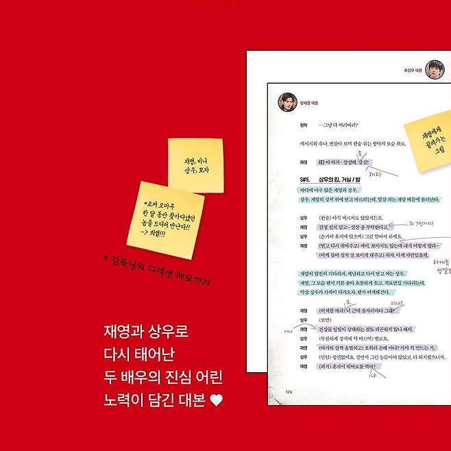 대본집은 왼쪽 장재영(박서함) 대본, 오른쪽 추상우(박재찬)의 대본을 동시에 실어서 각 배우들이 직접 대본에 남긴 수정된 대사, 포인트들까지 전부 비교하면서 볼 수 있음